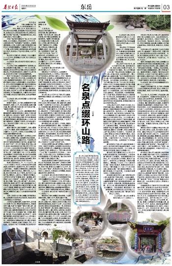 泰山环山路是贯穿泰安市城区东西的交通主干道,全长26公里(不含东延改造工程路段),沿泰山海拔200米等高线蜿蜒穿行,东起天烛峰,连接泰明路、凤台路、温泉路等10条南北向道路至桃花峪西路口,将桃花峪、天外村、红门、天烛峰四大景区整个连为一体,是泰山的风情线、保护线,也是一条向世人展示泰安形象的名片式景观大道。环山路地处山、城交接带,林木郁郁,清静幽雅,北侧自西而东有大众桥、冯玉祥墓、三阳观、五贤祠、烈士祠、普照寺、王母池等多处名胜古迹。随着2010年9月环山路全线贯通通车,沿环山路两侧一些载入历代志书的泰山名泉进一步展现在人们面前,这些名泉犹如一颗颗耀眼的明珠,点缀在风情线上,为环山路增添了无尽的风采。本文将简要介绍环山路沿线20处历史名泉(其中已消失名泉2处:飞鸾泉、鹁鸽崖鉴我泉)。