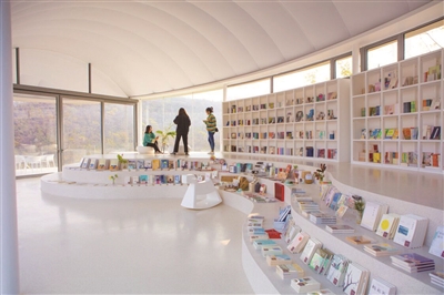 绕过民宿群,可以看到九女峰书房静立在山坳的制高点,流云一般的造型,背靠静谧村落,如同一朵悬停于山间的浮云。九女峰书房以白色为主,东临群山,背靠村落,驱车盘旋而上时便隐约可见。