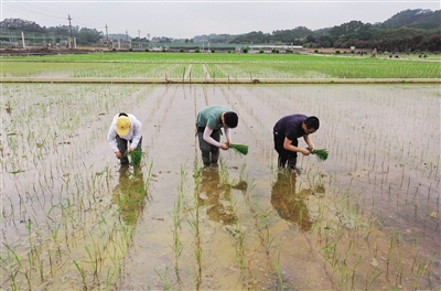3月29日,研究人员在广州增城华南农业大学试验田插种嫦娥五号搭载的太空稻秧苗(无人机拍摄)。