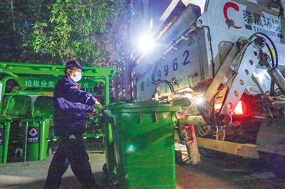 “我19时上岗,一直忙到次日凌晨4时。去的这些小区已经很熟了,小区里的老住户都很理解我们。”10月21日晚,垃圾清运员张恩利与同事到达东湖小区,开始收运垃圾。看着一个个“爆满”的垃圾箱,张恩利熟练地将其拖至垃圾清运车后,利用垃圾清运车钩环,将垃圾箱钩挂、抬举、翻转、倾倒……整个流程一气呵成。