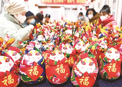 1月8日,在山东省聊城市东昌府区棉文化手工博物馆,工人缝制布艺生肖玩偶兔。 兔年临近,在山东省聊城市,兔年生肖玩偶迎来生产旺季。 新华社发