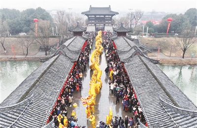 2月6日,文艺表演队伍从全椒县太平桥上经过(无人机照片)。 当日,安徽省全椒县传统民俗活动正月十六“走太平”拉开帷幕,巡游队伍穿过太平桥,献上精彩纷呈的民俗表演。 新华社发