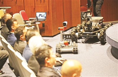 这是5月18日在黎巴嫩贝鲁特美国大学拍摄的机器人。 中国科学院沈阳自动化研究所向黎巴嫩民防总局捐赠“应急救援及勘察智能机器人”交接仪式18日在黎巴嫩贝鲁特美国大学举行。 新华社发