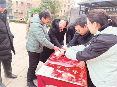 近日,岱岳区粥店街道滨河社区开展送福迎新年活动,工作人员为居民提前送上春联、福字等新春礼包。记者 徐文莉 文/图
