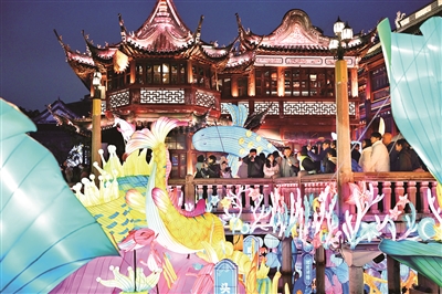 1月21日,游客在豫园九曲桥上赏灯。 当日,2024上海豫园民俗艺术灯会正式亮灯。今年豫园灯会续写“山海奇豫记”,以“海经篇”为主题,生肖龙灯、海底世界、鱼群起舞、奇幻仙境等场景让游客在灯火绚烂的国风幻境中喜迎龙年新春。 新华社发