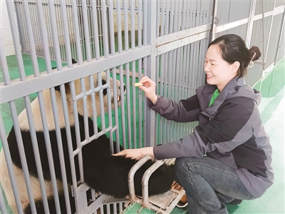 大年初二早上,杜小花和往常一样早早来到熊猫馆,她先将两只熊猫活动的外场和内馆打扫干净,并将它们吃的竹子冲洗干净,然后又马不停蹄地给它们做辅食,蒸窝窝头,清洗竹笋、胡萝卜、苹果。“做熊猫饲养员是个精细活,它们一天要吃4顿饭,吃的东西都是我们精心搭配的,你看我们这个窝窝头,是用大米面、豆面、玉米面、鸡蛋、钙粉等制作的,很有营养。”杜小花告诉记者。回忆起刚当饲养员的时候,杜小花说,她最初近距离接触熊猫时心里还有恐惧感,但几年相处下来,她现在觉得它们就像自己的孩子一样。正说着,饱餐竹子后的“武俊”调皮地拉了一坨粑粑。“你看它的粑粑,有青团、黄团,可能这时有的游客会捂鼻子,但我们却会和看自己的孩子一样,关心它的粑粑成不成型、颜色健不健康,看到它健健康康的,我们会忍不住夸赞:‘看!我们拉的粑粑都这么好’。”杜小花告诉记者,每天熊猫馆的工作人员都会给它们的粪便称重,通过粪便量观察它们的精神状态和饮食情况,每隔5天还要给它们称一次体重。