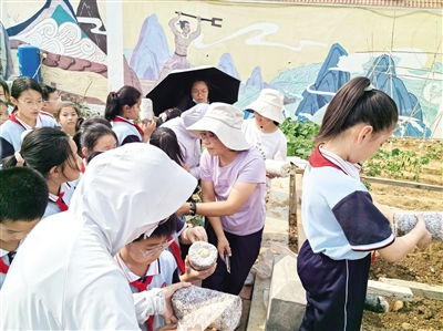 在劳动实践基地,市农科院科普专家从整地做畦、脱袋排放、覆土浇水、搭棚覆膜、出菇管理等方面向学生进行讲解,并现场示范灵芝种植。随后,学生领取菌包,动手参与灵芝种植过程,对灵芝的栽培有了更深刻的体悟。