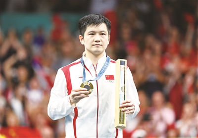 8月4日,冠军中国选手樊振东在颁奖仪式上。 当日,在巴黎奥运会乒乓球男单决赛中,中国选手樊振东4比1战胜瑞典选手莫雷高德,夺得金牌。 新华社发