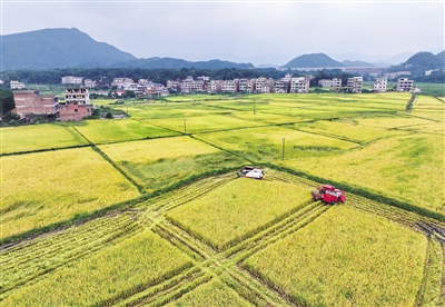 9月25日,湖南省常宁市洋泉镇洋洲村村民驾驶收割机在收割水稻(无人机照片)。 金秋时节,我国大部分地区陆续开始了秋收,到处洋溢着丰收的喜悦。新华社发