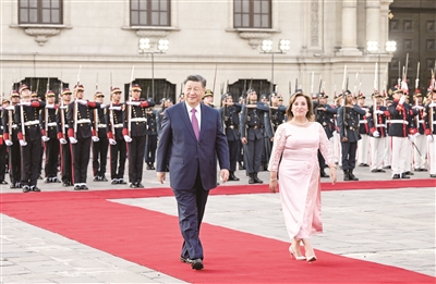 习近平指出,这是我第三次访问秘鲁,也是一年时间里第三次同总统女士会晤。许多秘鲁民众自发聚集道路两旁,挥手致意表示欢迎,让我深切感受到秘鲁人民对中国人民的友好情谊。中秘同为文明古国。古老文明的深厚积淀,赋予中秘两国智慧和胸怀,让我们能够看清历史前进方向,顺应时代发展潮流,始终坚持平等相待、互尊互信、互学互鉴,成为不同体量、不同制度、不同文化国家团结合作的典范。建交53年来,特别是我2016年对秘鲁进行首次国事访问以来,在双方共同努力下,中秘贸易投资合作快速增长,为两国人民带来实实在在的利益。双方要总结经验,推动两国务实合作提质升级,