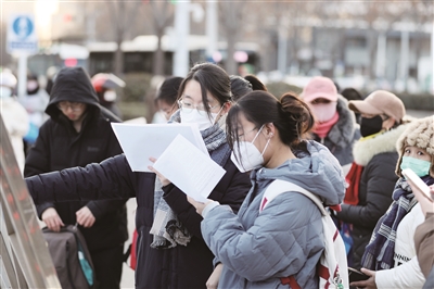 21日上午8时许,在泰安长城中学、泰安一中青年路校区等考点外,考生裹着厚厚的棉衣,正排队有序走进考场。不少考生拿着书本或资料,抓紧进场前的一分一秒,全神贯注地再次复习着每一个知识点。虽然目标学校不尽相同,参加研考的出发点也不完全相同,但大家在此刻都是“研”途闪闪发光的追梦人。今年研考首日恰逢我国二十四节气中的冬至,这对不少考生来说也是一份惊喜。