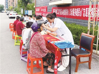 本报6月27日讯(记者 张芮 通讯员 李文萱)近日,泰山区岱庙街道社区卫生服务中心联合医共体牵头单位泰安市中医二院、泰安市同医仁眼科医院、岱庙街道花园社区,在育新园小区广场开展“全国老年健康宣传周”义诊活动。