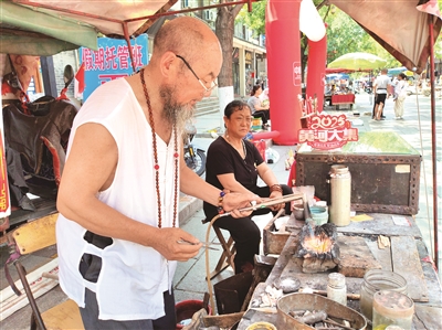 本报7月7日讯(记者 刘小东)6日,清晨的阳光刚染红岱庙檐角,老县衙东侧的通天街上已有摊主铺开毡布。沉寂一年多后,通天街文玩市场重新开市,吸引了众多市民、游客前往“淘宝”。
