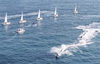 青岛老龙湾海域,船艇列队参加海上巡游活动(7月10日摄,无人机照片)。为迎接中国航海日,青岛市举行“我们来航海”海上巡游活动。市民和游客受邀乘坐帆船、游艇出海,体验海洋文化的魅力。2025年是中国航海日设立20周年,也是郑和下西洋620年。今年航海日活动以“绿色航海 向新图强”为主题。 新华社发