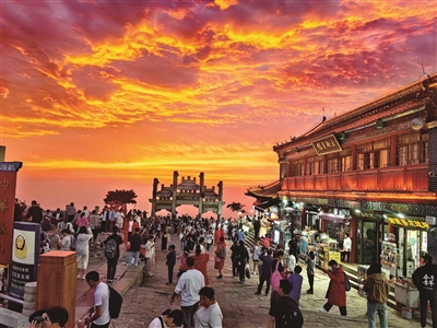 当日傍晚,落日熔金,泰山之巅的天街、日观峰、玉皇顶成为最佳观景台。随着夕阳西沉,天空逐渐被染成橙红色,云朵像是被点燃了一般,变幻出各种形态。在泰山极顶,古老的建筑与绚丽晚霞相互映衬,“天街”牌坊在晚霞余晖下更显古朴庄重,天地在此刻交融。游客纷纷拿出手机、相机,记录下这震撼瞬间,欢呼声、赞叹声在山间回荡。