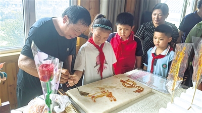 在糖画和面塑非遗展示区,市级非遗张氏面塑糖塑传承人张德友手持小勺,舀起一勺金黄透亮的糖稀,手把手教孩子们绘制糖画,随着手腕轻抖,糖稀如细丝般流淌而下并凝结出一个个不同造型的图案。