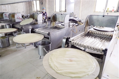 在泰安市正邦食品机械有限公司的生产车间内,自动化煎饼生产线高速运转,和面、摊制、成型等工序一气呵成,仅需少量工人监控操作,日产煎饼可达1000公斤。