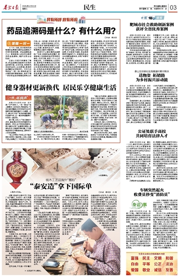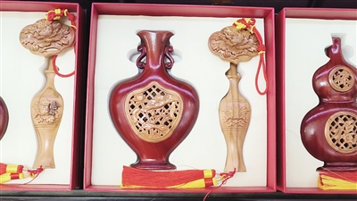 大到桃木剑、桃木如意,小到各种挂件、摆台,一件件桃木工艺品即将发往全国各地。不久前,程银贵带着一批桃木工艺品东渡日本,让这张“泰安名片”亮相大阪展览会。“平安如意”摆件、“泰山图”看盘,以及各类手串、车挂、包挂等饰品,引起众多参展商、采购商的浓厚兴趣。