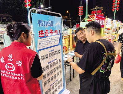 本报9月15日讯(记者 张芮)近日,泰山区行政审批服务局联合岱庙街道办事处、北新社区开展“泰小驿”政务服务进夜市活动,工作人员化身“夜市服务员”,为市民办理业务、解读政策。