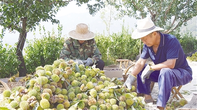 在板栗地,栗农穿梭在栗林下,忙碌又有序地采摘、去壳、装袋。“村里自然环境好,适合种板栗。我家种了430多亩栗子,按照目前价格来看,今年预计收入能有70万元左右,肯定是个丰收年。”种植户陈勇兴奋地说。