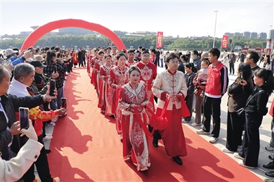 10对新人身着典雅的中式礼服,在亲友、嘉宾的注目中,手执牵巾徐徐步入婚礼现场。完成庄重的“三揖三让”之礼后,新人共饮合卺酒、行结发礼、签婚书、执手盟誓……一系列古韵十足的仪式,不仅承载着传统婚俗的深厚内涵,也为新人们留下了一份终生难忘的美好回忆。