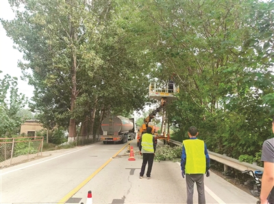 泰安交警高新区大队执勤民警在巡逻途中发现,县道103篦子店村至北集坡村路段树木茂密,车辆在行驶过程中视线会受到遮挡,存在安全隐患。为解决这一问题,执勤民警对各路段进行细致全面排查,联合泰安高新区综合行政执法局工作人员对影响道路交通安全的行道树进行修剪。执勤民警在影响行车视距需修剪、整修的重点路段及时设置警戒线、警示标志,指挥疏导车辆,提醒过往群众注意安全。