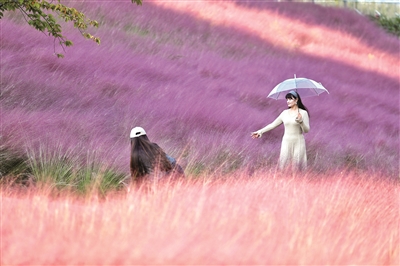 近日,岱岳区粥店路街角公园的粉黛乱子草进入花期,连片的粉色花穗在风中摇曳,远望如烟似霞。市民漫步其中,仿佛置身童话世界。该花花期预计持续至11月中下旬。
