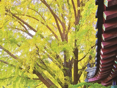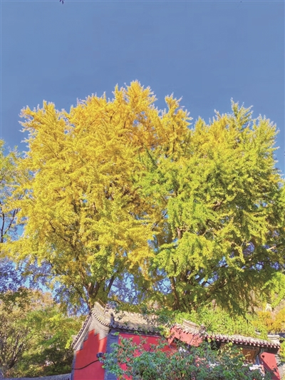 深秋时节,泰山斗母宫前院的两株古银杏树再次呈现“一树金黄、一树青绿”的奇特景观,西株身披“黄金甲”,东株犹穿“青罗裳”,黄绿相映,满院生辉。这两株相距仅数步之遥的古树,以截然不同的色彩装点着秋日泰山,成为一道独特的风景线。