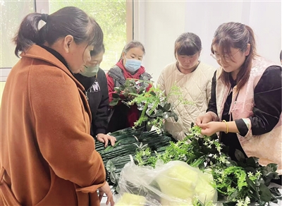 培训中,培训师围绕手工制品的精细化加工与成品质量控制展开教学,重点讲解了花艺装饰的配色技巧、编织篮的加固方法等实用内容,并进行分步演示和一对一指导。参训居民一边整理花材、编织框架,一边交流操作心得。“一期培训我们为学员讲解了花材制作的基础内容,二期则在细节上下功夫,让学员通过反复练习规范技法,更适配市场要求。”培训师说。