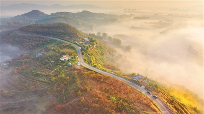 这是11月4日在山东省临沂市沂南县界湖街道拍摄的被云雾笼罩的朱家岭村(无人机照片)。 立冬将至,全国各地秋意仍浓,以斑斓色彩迎接冬天到来。 新华社发