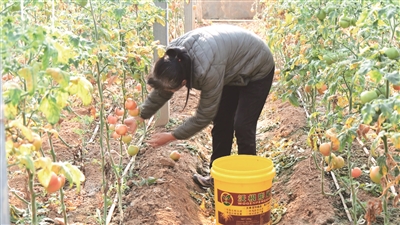 ◀村民在大棚内采摘西红柿。