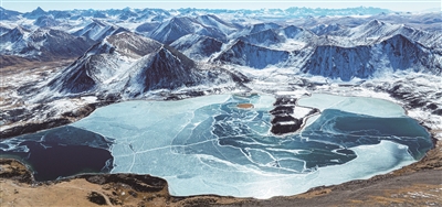 这是12月13日拍摄的思金拉错冬日风光(无人机照片)。 思金拉错位于拉萨市墨竹工卡县日多乡东南、山南市桑日县增期乡以北,湖面海拔约4500米。 冬日,思金拉错湖面结冰封冻,冰湖雪峰相映成趣,构成一幅洁净的冬日画卷。 新华社发