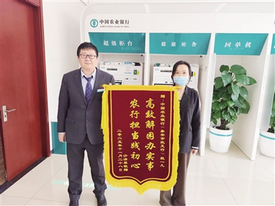 事后,为表达感激之情,客户专程来到网点,送来一面写有“高效解困办实事 农行担当践初心”的锦旗,客户说:“真的特别感谢,为了我一个客户,你们前前后后协调了这么多部门,这份用心让我特别感动。”
