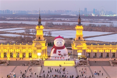 这是12月15日在哈尔滨市群力音乐公园拍摄的大雪人(无人机照片)。 12月15日,哈尔滨市群力音乐公园大雪人完成主体建设,进入到最后的细节打磨阶段。大雪人设计身高19米、长14米、宽11米,总用雪量超过3000立方米,比往年增加1200立方米,为历年之最。新华社发