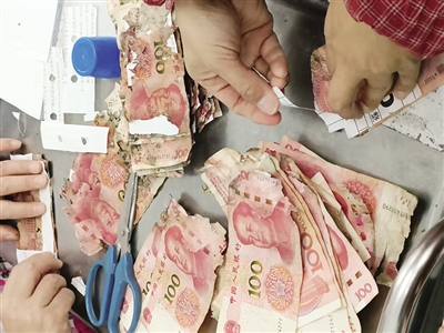 原来,老人存放在家中的2.5万元现金因保管不慎致使严重霉烂粘连,部分票面已模糊不清。了解该情况后,工作人员立即安抚老人情绪,耐心告知其残损人民币兑换的相关政策,同时迅速开启残损币兑换绿色通道。