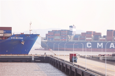 2026年1月8日,一艘货轮(左)停靠在宁波舟山港梅山港区码头。 近日,记者从宁波舟山港获悉,2025年宁波舟山港完成货物吞吐量超14亿吨,连续17年位居全球第一,宁波舟山港也由此成为全球首个年货物吞吐量超14亿吨的大港。新华社发