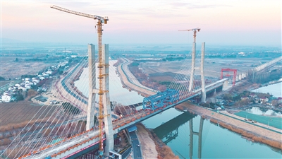 这是1月9日拍摄的沪宁合高铁南京特大桥跨滁河斜拉桥(无人机照片)。 1月8日晚,新建上海至南京至合肥高速铁路(以下简称沪宁合高铁)控制性工程——南京特大桥跨滁河斜拉桥顺利合龙,标志着该斜拉桥正式转入桥面系施工阶段。 新华社发