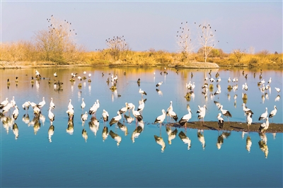 1月10日,鸟儿在江苏兴化里下河国家湿地公园内栖息、觅食(无人机照片)。
