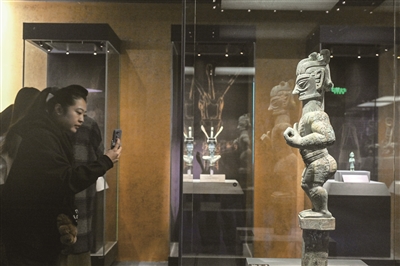 1月18日,观众参观展出的青铜着裙立人像。 由国家文物局指导,中国国家博物馆、四川省文物局主办的“双星耀世——三星堆—金沙遗址古蜀文明展”18日在北京中国国家博物馆开幕,展期为7个月。 本次展览荟萃200余件(套)来自三星堆博物馆、成都金沙遗址博物馆、四川省文物考古研究院、成都市文物考古研究院以及中国国家博物馆的精美文物,引领观众步入神秘而辉煌的古蜀世界。 新华社发