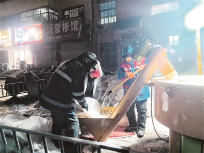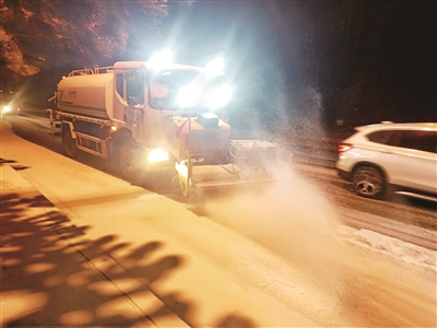 17日以降水为主,18日夜幕降临,降雪渐紧。在环山路西段,泰安市东岳城服有限公司保洁四公司的李祥意和180余名同事已奋战多时。“我们负责天外村到大玉石这一段,重点清理坡道和弯道。”李祥意裹紧棉衣,呵着热气对记者说。他身后,大型撒布车匀速驶过,将融雪剂均匀地撒下。人行道上,环卫工人挥动铁锨和扫把,仔细清理步道砖上的积雪和薄冰。“目前,我们已经用了18吨融雪剂。雪下多久,我们就干多久!”在路灯灯光的映照下,李祥意的脸上泛着红光。