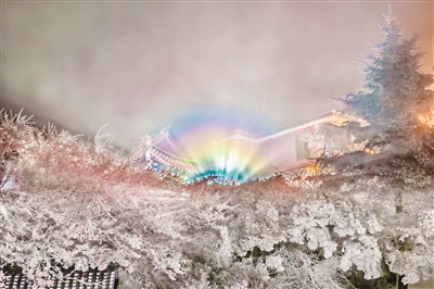 “华”是大气的一种光学现象。日华、月华比较常见,相比之下,由人工光源(如路灯、建筑照明)形成的“华”极为罕见,且持续时间短暂,往往转瞬即逝。1月18日夜晚的泰山之巅,雨雪与浓雾交织,从陈爱国拍摄的照片看,山顶灯光穿透清冷湿雾,在镜头中浮现出一圈梦幻般的彩色光晕:中心为明亮白光,外围由蓝绿色渐变为金黄、橙红,层次分明,奇幻而震撼。