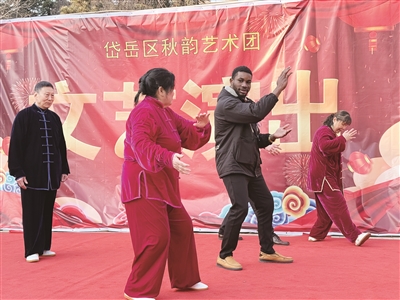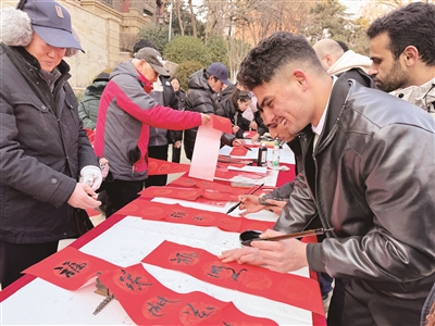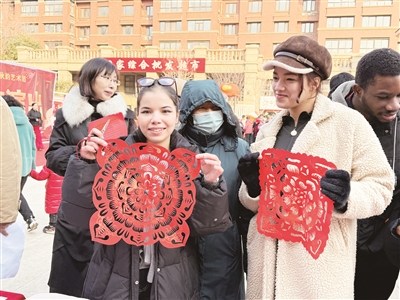 现场,书法家挥毫书写福字、春联,社区剪纸达人剪裁精美窗花,精彩的节目轮番上演。留学生们也跃跃欲试,有的提笔蘸墨临摹春联,有的拿起剪刀学习剪窗花,有的跟随居民学起了八段锦,现场氛围热烈。