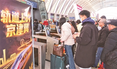 1月26日,旅客在天津西站检票。 1月26日,全国铁路实行新的列车运行图。国铁北京局首次开行京津冀环线高铁列车,方便京津冀旅客的通勤出行。新华社发