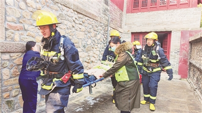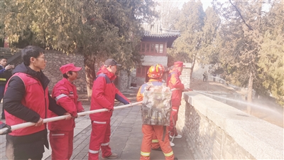近日,泰山景区虎山管理区联合泰山景区消防救援大队开展古建筑联合消防演练。