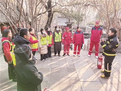 演练结束后,消防救援人员结合文物古建特点开展消防安全知识培训,围绕文物场所日常管理中加强火源管控、用电安全和初期火灾扑救、疏散逃生等内容进行了系统讲解。