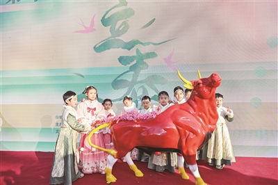 2月4日,“春姑娘”“牛童”手持花枝鞭打春牛。 2月4日是立春,北京市东城区建国门街道第十九届立春文化活动在北京古观象台举行。文化活动重点展示立春时节“打春牛”等传统民俗,结合文艺表演、文旅市集等互动活动,让市民在民俗中体验传统文化的魅力,喜迎春天的到来。 新华社发