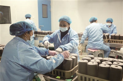 “接好了,这筐有点儿沉”“小心点儿,别碰着人”……菌包生产车间里,几十名工人竞赛似的拼着手速,套膜、接袋、码堆,目不暇接中不见丝毫慌乱,灌装好的菌包码得整整齐齐,等待运往蒸汽灭菌车间。