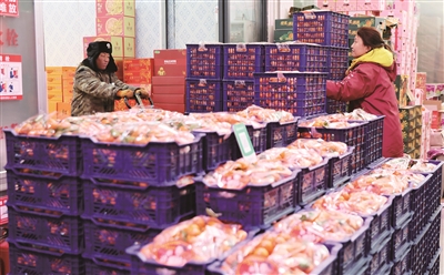 2月5日,在东北新发地农产品供应链中心,两名工人在运送水果。 春节将至,位于辽宁省盘锦市的东北新发地农产品供应链中心蔬果吞吐量迎来高峰,来自南方的蔬菜水果在这里进入东北地区市场,东北地区的特产从这里发往全国各地,南北年货的相遇让春节的年味更加浓郁。 新华社发