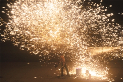 2月8日拍摄的非遗“打铁花”表演。 近日,首届“浦东中国年味节”在上海市浦东新区黄浦江畔举行,非遗“打铁花”成为夜色中一道亮丽的风景线。 新华社发