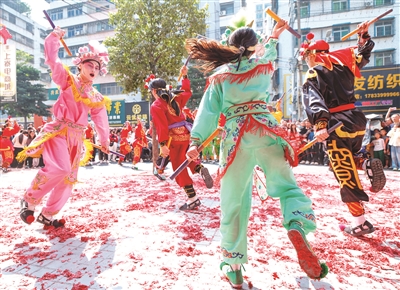 2月22日,广东省普宁市池尾街道上寮英歌队在街头表演英歌舞。 2月22日是农历大年初六,广东省普宁市不少商铺选择在这一天开门迎客,开启新一年的经营。在普宁市池尾街道,上寮英歌队身着传统服饰,伴随着铿锵有力的锣鼓声走上街头,挥槌起舞,以充满力量感的英歌舞表演传递对新一年事业兴旺、开工大吉的美好祝福。 新华社发